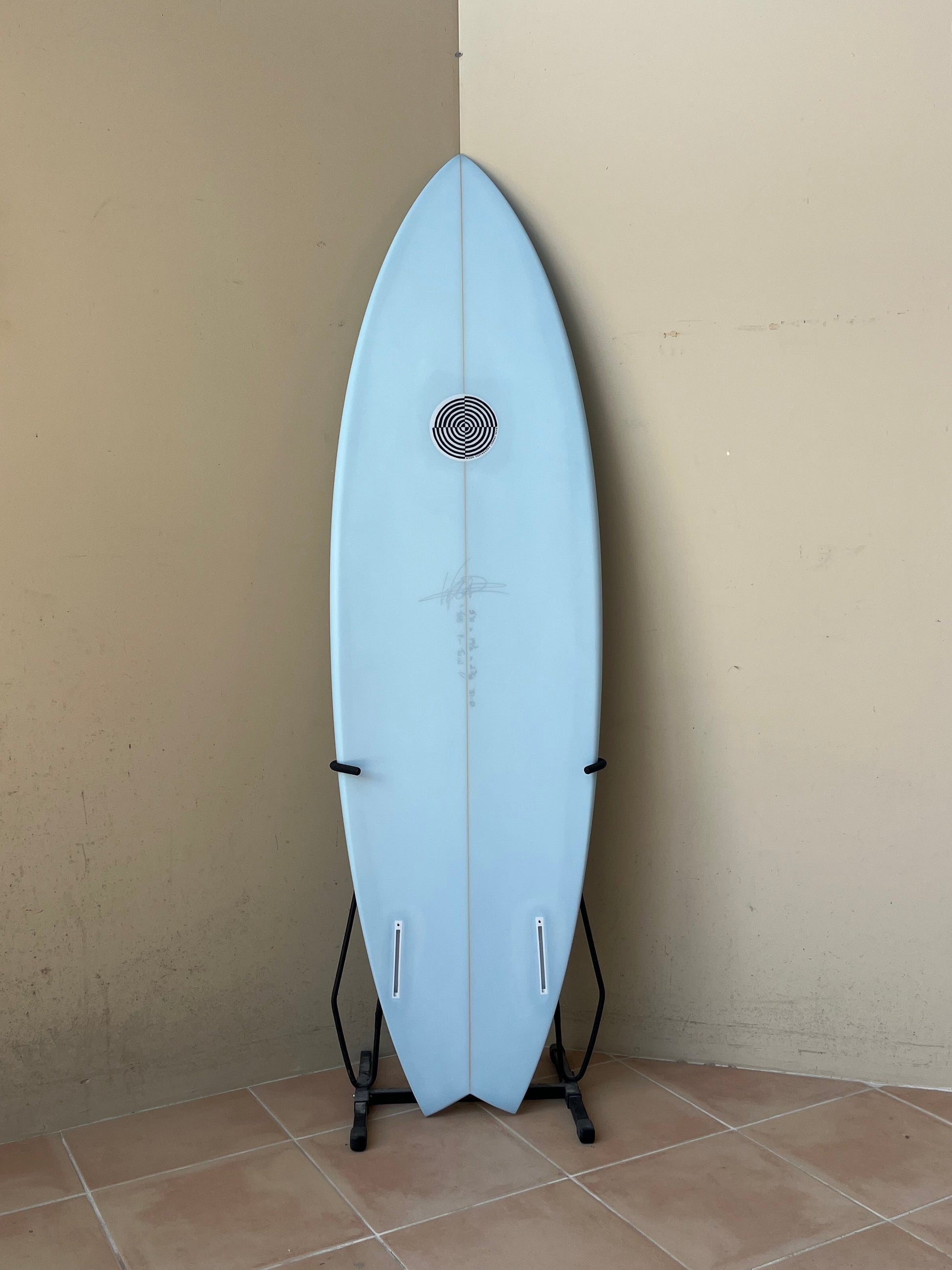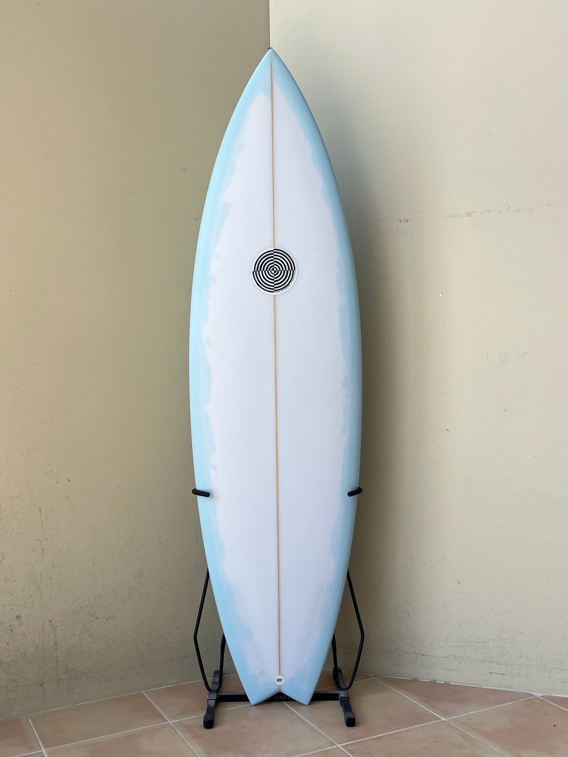 twin fin future boxes , with pastel blue bottom pigment.